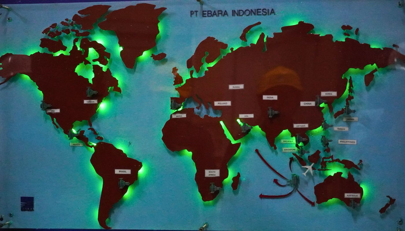 - Go Tour Team – PT Ebara Indonesia as a Global Hub, a modern world map with LED design showcasing Indonesia’s strategic role in the global network.